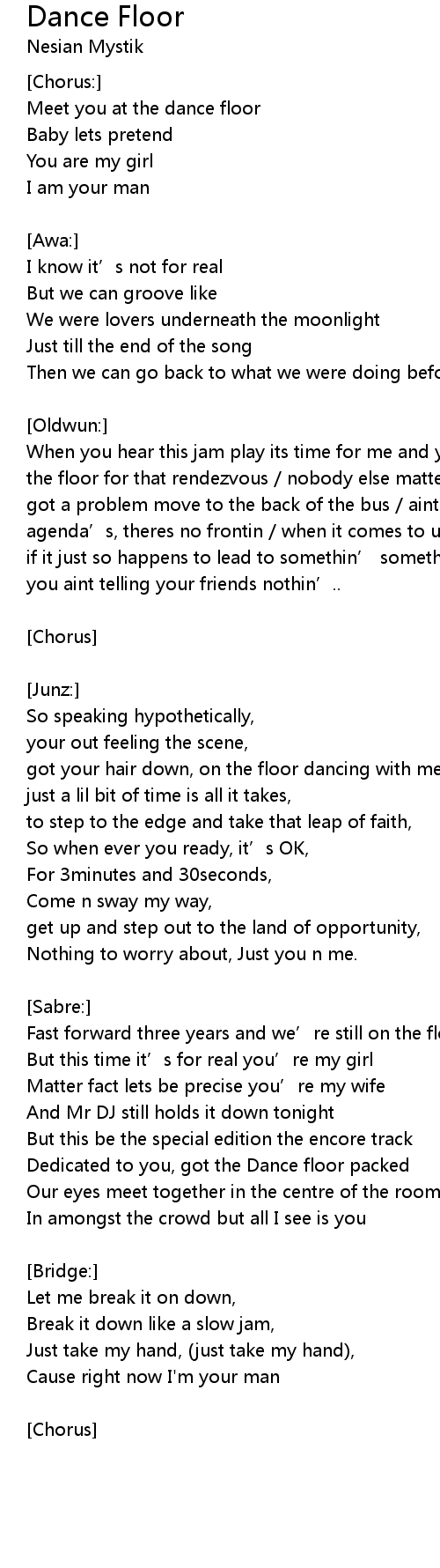| When you hear this jam play its time for me and you / to meet in the middle of the floor for that rendezvous / nobody else matters in the spot but us / anybody got a problem move to the back of the bus / aint no fussin’, no hidden agenda’s, theres no frontin / when it comes to us, you know its pure lovin / if it just so happens to lead to somethin’ somethin’ / when it time to leave you aint telling your friends nothin’.. | |