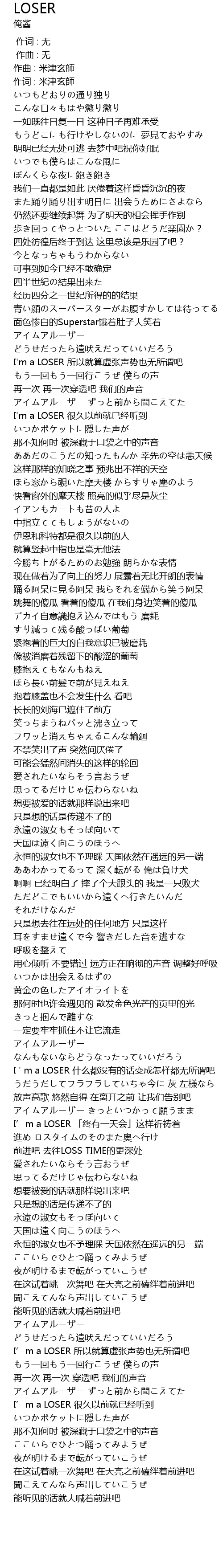 | [01:13.353] | I' m a LOSER hěn jiǔ yǐ qián jiù yǐ jīng tīng dào |