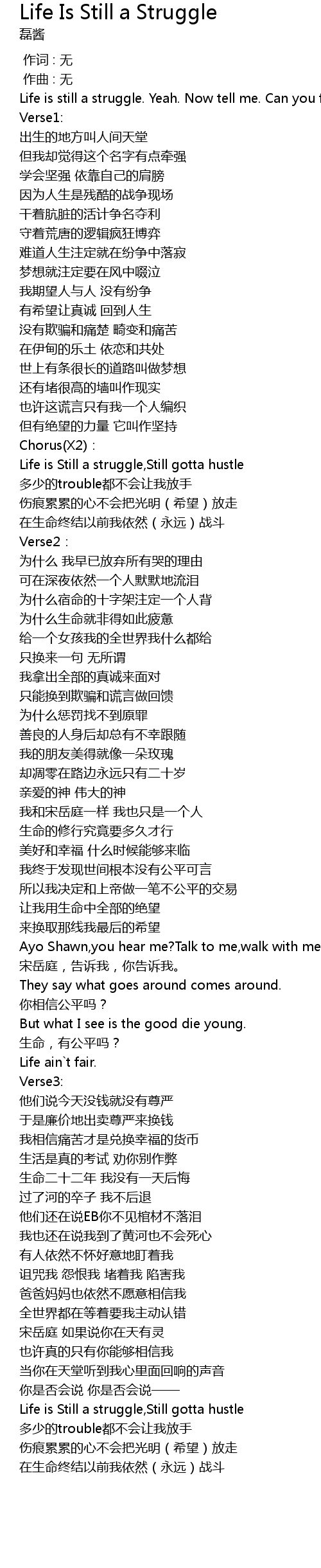 | [01:02.624] | Life is Still a struggle,Still gotta hustle |