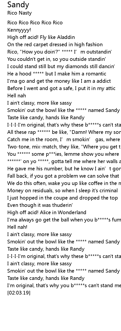 | [01:52.74] | Smokin' out the bowl like the ***** named Sandy |