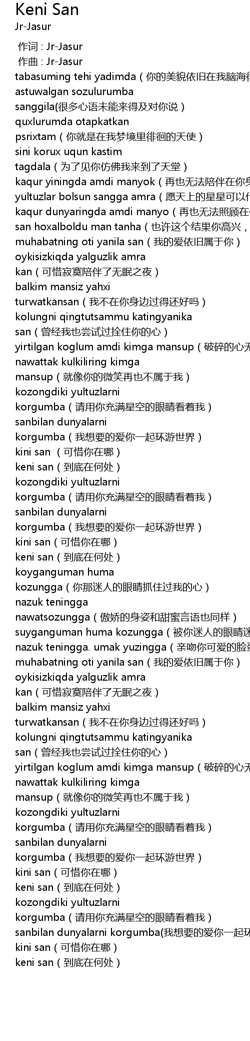 | [00:00.000] | 作词 : Jr-Jasur |