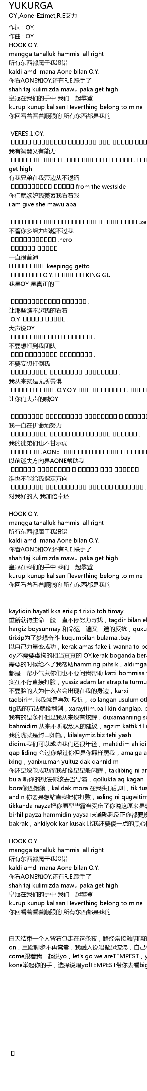 | kaytidin hayatlikka erixip tirixip toh timay 重新获得生命一般一直不停努力寻找,tagdir bilan elixip qelixip hargiz boysunmay 和命运一遍又一遍的反抗,quxumni.dap tirixip为了梦想奋斗 kuqumbilan bulama..bay 以自己力量变成功,kerak.amas fake i. wanna to be.real oy.不需要虚构的相当真真的 OY.kerak boganda beramaysa yardam 需要的时候给不了我帮助hamming pihsik,aldimga yardam sorap kamma 都是一帮小气鬼你们也不要问我帮助 katti bommisa tikima mih 实在不行直接打脸,yussiz adam lar atrap.ta turmuxta yenimda jik 不要脸的人为什么老会出现在我的身边,karxi tadbirim.lik我就是喜欢 反抗,kollangan usulum.otkur tig我的方法就像利剑,xarayitim.ba likin danglap. bahmidim 我有的是条件但是我从来没有炫耀,duxamanning sozini.pakat anglap bahmidim.从来不听取敌人的建议,agzim kattik tilim tax diding 我的嘴就是封口如瓶,kilalaymiz.biz tehi yash didim.我们可以成功我们还很年轻,mahtidim ahlidim karliding boktammi qap liding 夸过你帮过你但是你照样黑我,amalga axmidi ixing,yanixu.man yultuz dak qahnidim 你还是没能成功而我却像星星般闪耀,taklibing ni anglidim.rijisor bula 听你的想法你该去当导演,qollukta aq kagan bora像匹饿狼,kalidak mora 在我头顶乱叫,tik tusang mux bilan orup andin 你要是想站直我把你打败,asling ni qugwitima,oy ka daysa tikkanda nayza把你原型毕露当受伤了你说这原来是想象,tami birhil payza hammidin yaysa 味道熟悉反正你都要挨一遍mandin bakrak,ahkilyok kar kusak 比我还要傻一点的黑心眼 | |