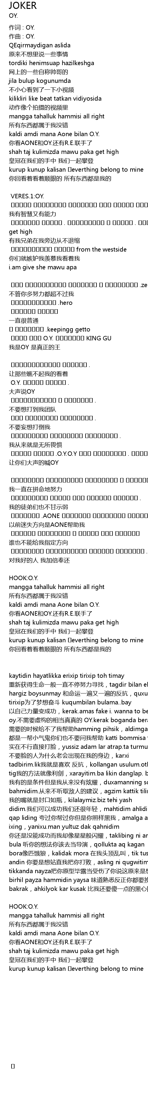 | kaytidin hayatlikka erixip tirixip toh timay 重新获得生命一般一直不停努力寻找,tagdir bilan elixip qelixip hargiz boysunmay 和命运一遍又一遍的反抗,quxumni.dap tirixip为了梦想奋斗 kuqumbilan bulama..bay 以自己力量变成功,kerak.amas fake i. wanna to be.real oy.不需要虚构的相当真真的 OY.kerak boganda beramaysa yardam 需要的时候给不了我帮助hamming pihsik,aldimga yardam sorap kamma 都是一帮小气鬼你们也不要问我帮助 katti bommisa tikima mih 实在不行直接打脸,yussiz adam lar atrap.ta turmuxta yenimda jik 不要脸的人为什么老会出现在我的身边,karxi tadbirim.lik我就是喜欢 反抗,kollangan usulum.otkur tig我的方法就像利剑,xarayitim.ba likin danglap. bahmidim 我有的是条件但是我从来没有炫耀,duxamanning sozini.pakat anglap bahmidim.从来不听取敌人的建议,agzim kattik tilim tax diding 我的嘴就是封口如瓶,kilalaymiz.biz tehi yash didim.我们可以成功我们还很年轻,mahtidim ahlidim karliding boktammi qap liding 夸过你帮过你但是你照样黑我,amalga axmidi ixing,yanixu.man yultuz dak qahnidim 你还是没能成功而我却像星星般闪耀,taklibing ni anglidim.rijisor bula 听你的想法你该去当导演,qollukta aq kagan bora像匹饿狼,kalidak mora 在我头顶乱叫,tik tusang mux bilan orup andin 你要是想站直我把你打败,asling ni qugwitima,oy ka daysa tikkanda nayza把你原型毕露当受伤了你说这原来是想象,tami birhil payza hammidin yaysa 味道熟悉反正你都要挨一遍mandin bakrak,ahkilyok kar kusak 比我还要傻一点的黑心眼 | |