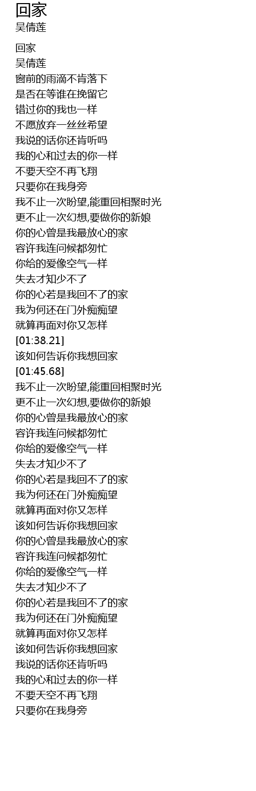 | [01:39.35] | gāi rú hé gào sù nǐ wǒ xiǎng huí jiā |