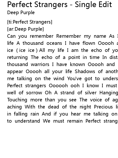 | [00:19.339] | Can you remember Remember my name As I flow through your life A thousand oceans I have flown Ooooh and cold Cold spirits of ice ice ice All my life I am the echo of your past I am returning The echo of a point in time In distant faces shine A thousand warriors I have known Ooooh and laughing As the spirits appear Ooooh all your life Shadows of another day And if you hear me talking on the wind You' ve got to understand We must remain Perfect strangers Oooooh ooh I know I must remain inside this silent well of sorrow Oh A strand of silver Hanging through the sky Touching more than you see The voice of ages in your mind Ooooh is aching With the dead of the night Precious life Your tears are lost in falling rain And if you hear me talking on the wind You' ve got to understand We must remain Perfect strangers |