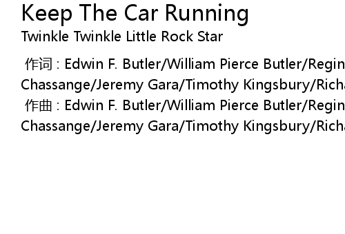 | [00:00.000] | 作词 : Edwin F. Butler/William Pierce Butler/Regine Chassange/Jeremy Gara/Timothy Kingsbury/Richard R. Parry |