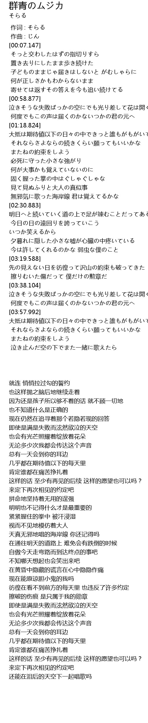 | [03:57.992] | 大抵は期待値以下の日々の中できっと誰もがもがいている |