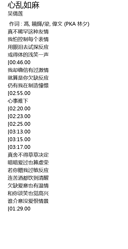 | [03:08.00][02:55.00][02:28.00][02:15.00][01:14.00][01:01.00] | 心乱如麻 心事难下 |