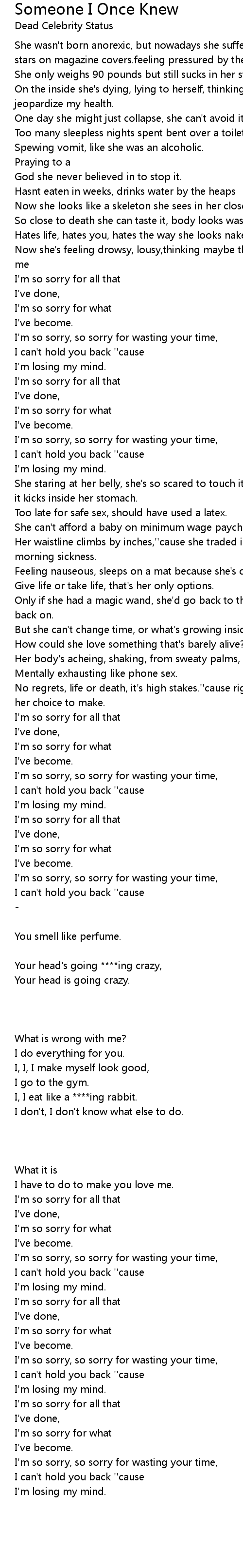 On the inside she's dying, lying to herself, thinking:- 5 more pounds won't jeopardize my health. |