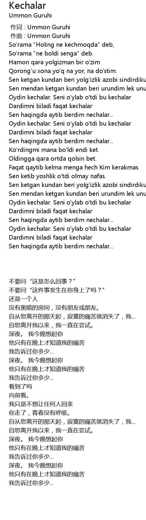 | [02:53.485] | Dardimni biladi faqat kechalar |