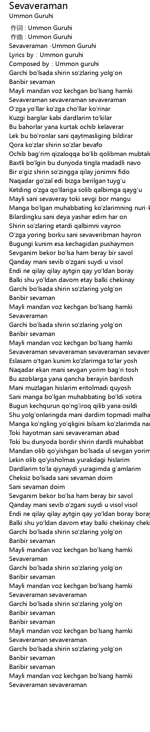 | [01:13.320] | O'zga yoring borku sani sevaveribman hayron |