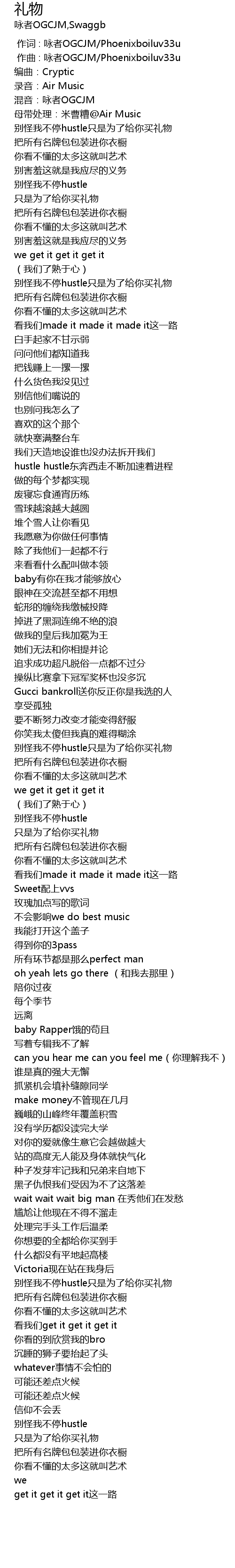 | [03:00.357] | 别怪我不停hustle只是为了给你买礼物 |