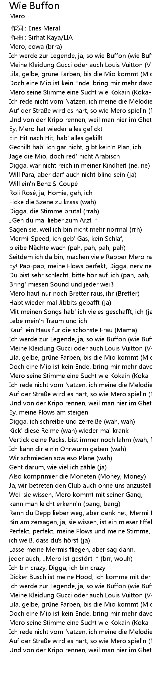 | [02:03.11] | Ich werde zur Legende, ja, so wie Buffon (wie Buffon) |