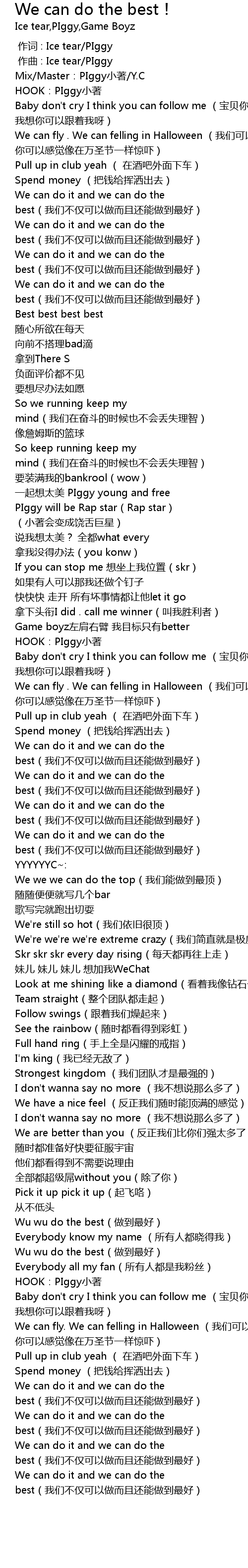 | [02:38.103] | We can do it and we can do the best wǒ men bù jǐn kě yǐ zuò ér qiě hái néng zuò dào zuì hǎo |