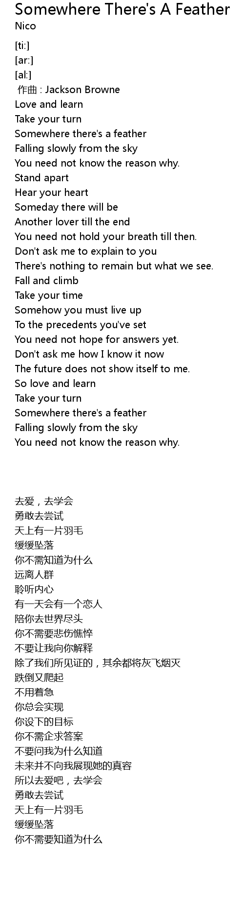 | [00:17.07] | Somewhere there's a feather |