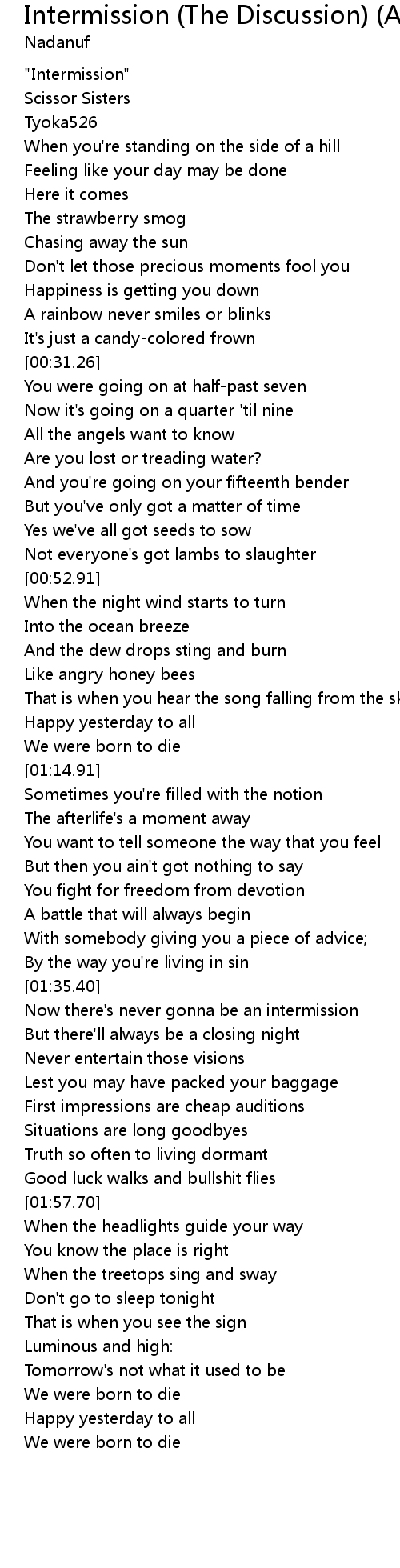 | [01:37.38] | Now there's never gonna be an intermission |