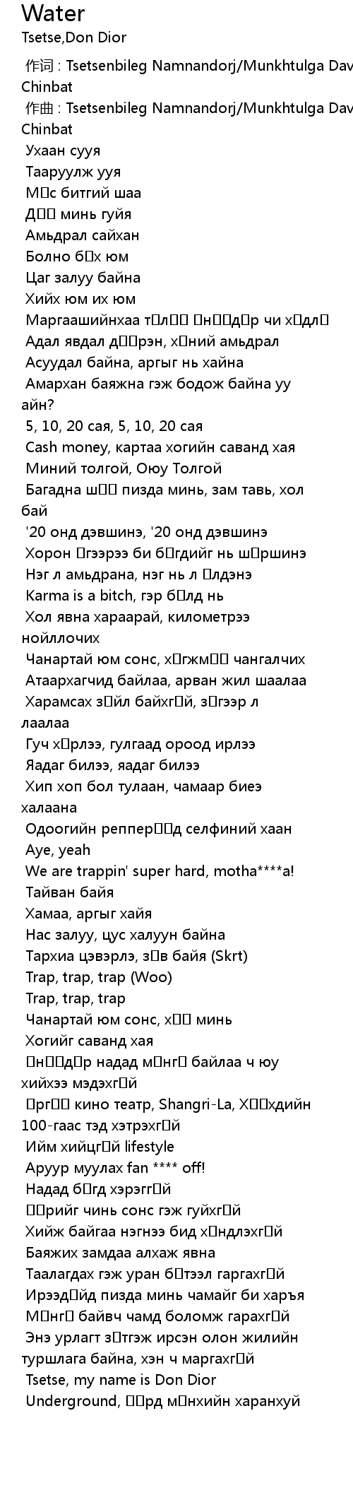 作词 : Tsetsenbileg Namnandorj/Munkhtulga Davaadorj/Erdene-Ochir Chinbat |