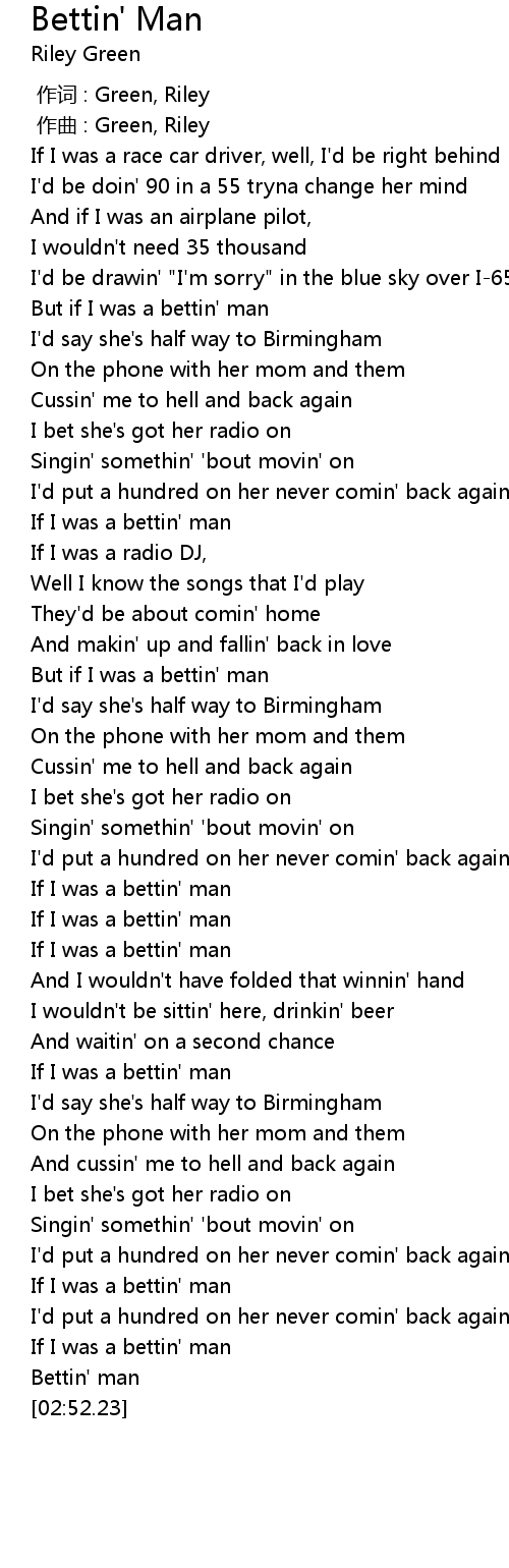 | [00:53.31] | I' d put a hundred on her never comin' back again |