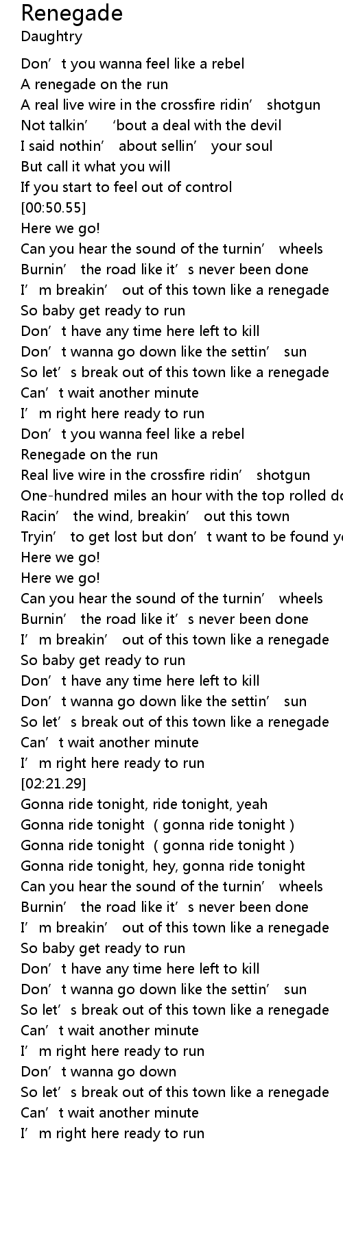 | [01:25.01] | Renegade on the run |
