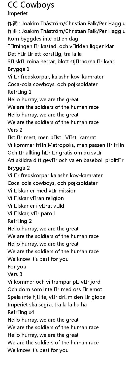 | 作词 : Joakim Thåström/Christian Falk/Per Hägglund/Gunnar Ljungstedt | |