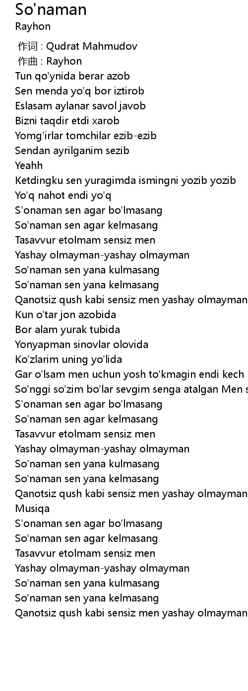| [02:17.952] | S'onaman sen agar bo'lmasang |
