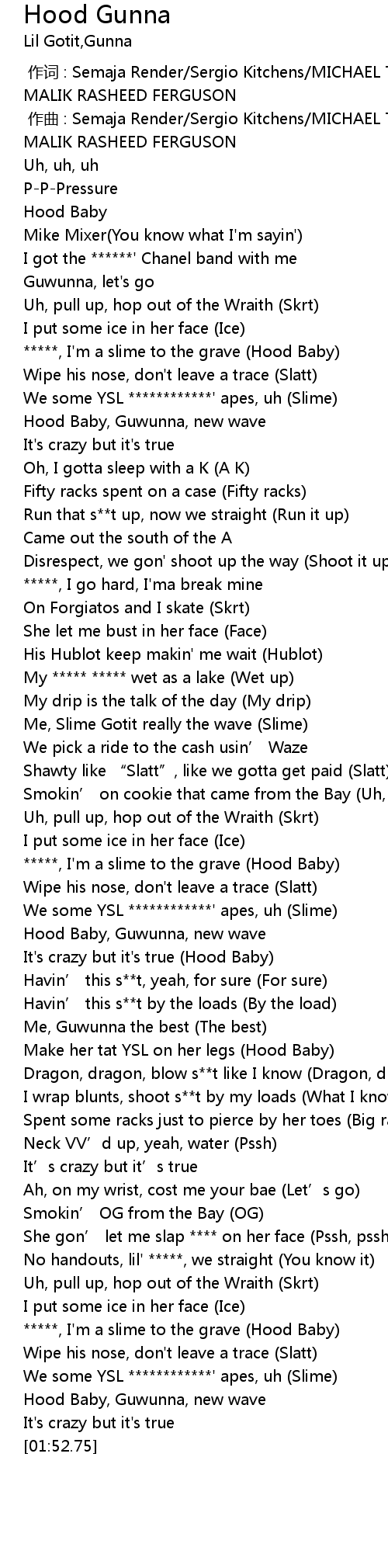 | [01:42.69] | *****, I'm a slime to the grave (Hood Baby) |
