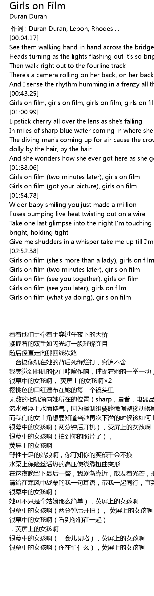 | [03:02.28] | Girls on film two minutes later, girls on film |
