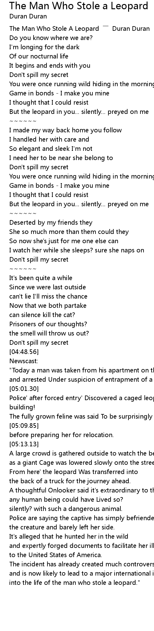 | [00:03.08] | The Man Who Stole A Leopard Duran Duran |