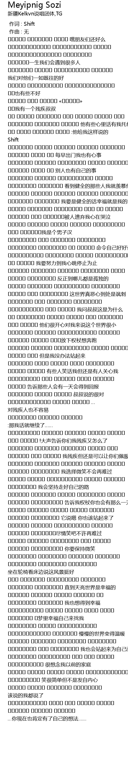 | [01:29.943] | تەبىئەتكە توۋلاپ كېتىمە مېيىپ بوسام نىم بوپتۇ !大声告诉你们我残疾又怎么了 |