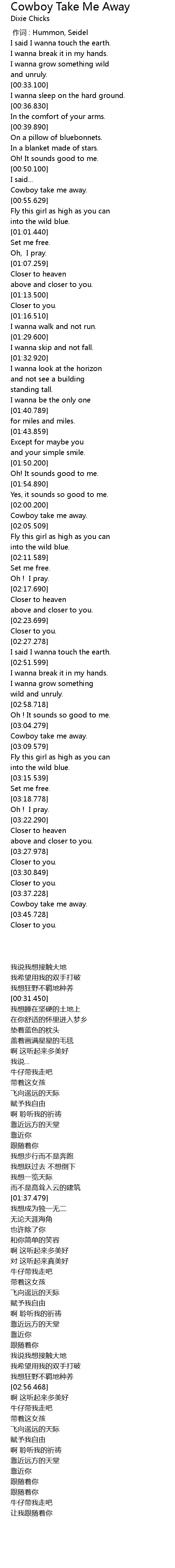 | [00:52.500] | Cowboy take me away. |