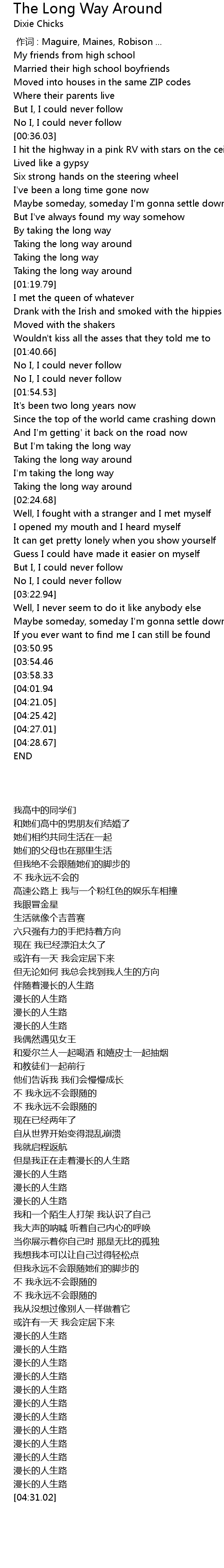 | [04:17.11][04:01.94][03:47.00] | Taking the long way around |