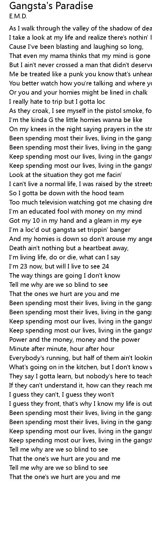 | Keep spending most our lives, living in the gangsta's paradise | |