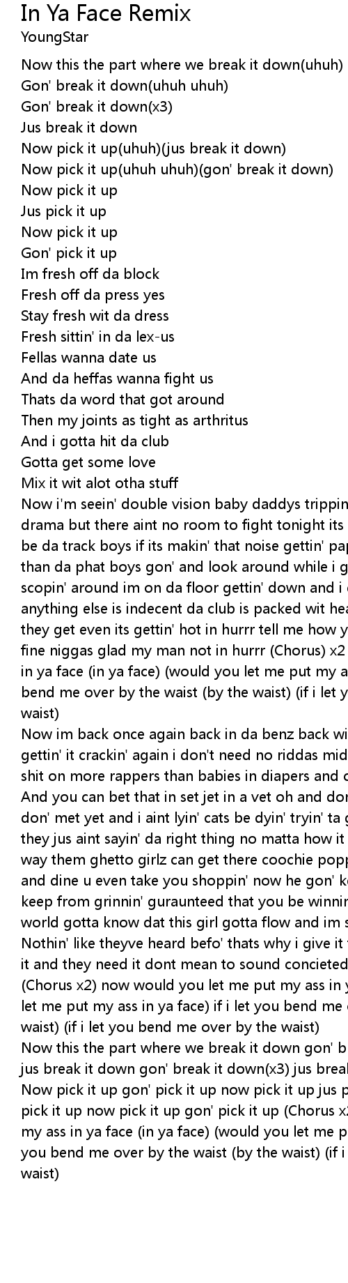 Now pick it up gon' pick it up now pick it up jus pick it up now pick it up jus pick it up now pick it up gon' pick it up (Chorus x2) now would you let me put my ass in ya face (in ya face) (would you let me put my ass in ya face) if i let you bend me over by the waist (by the waist) (if i let you bend me over by the waist) |