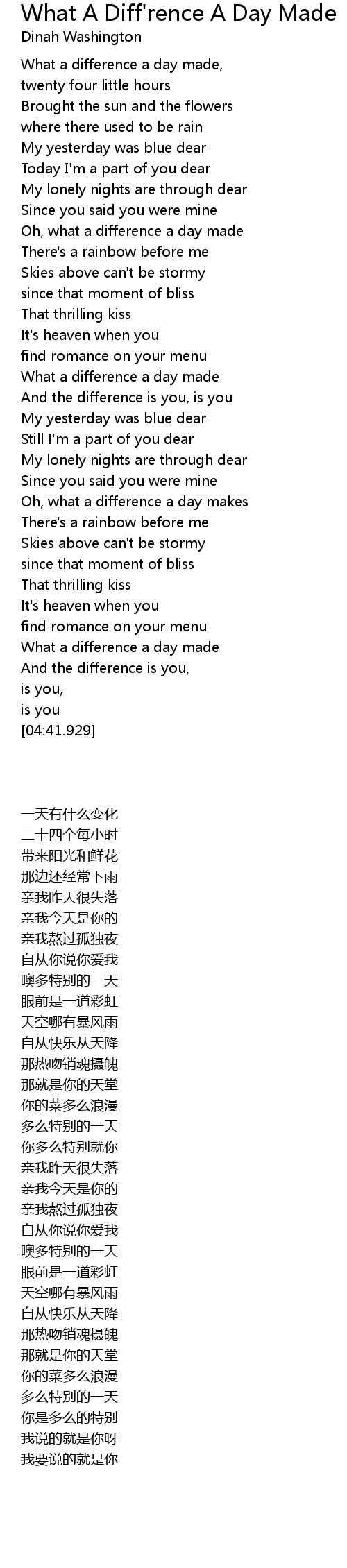 | [01:16.110] | Oh, what a difference a day made |