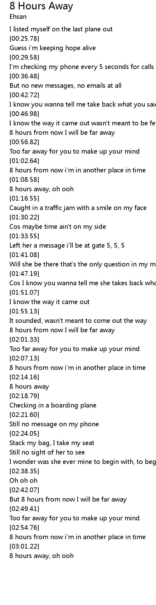 | [03:05.71] | 8 hours away, oh ooh |