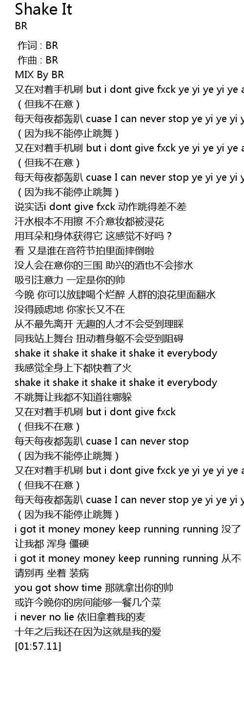 | [01:07.94] | shake it shake it shake it shake it everybody |