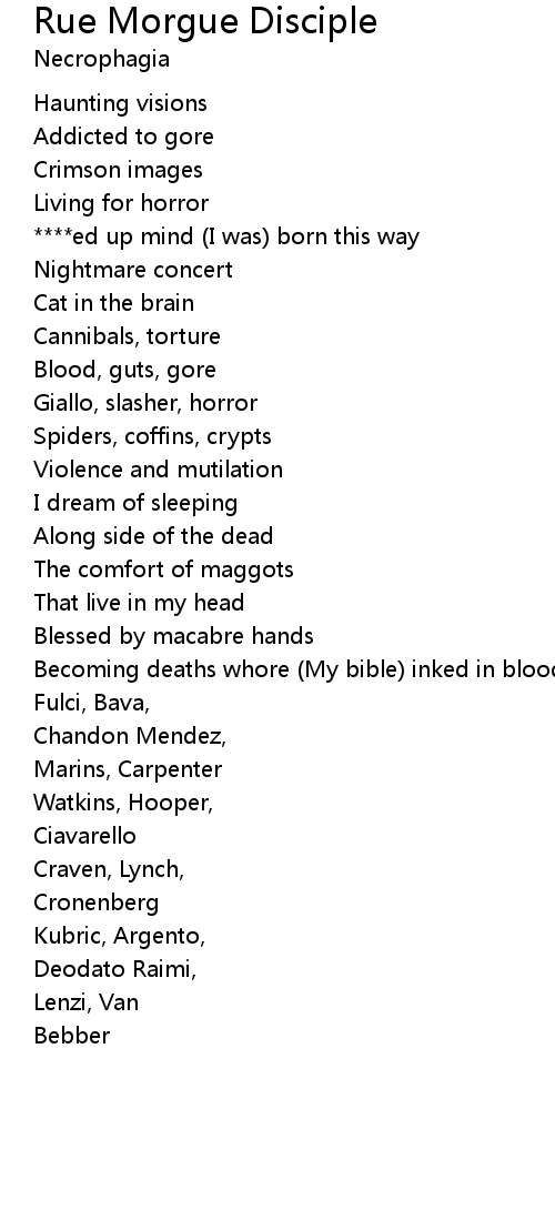 | Becoming deaths whore (My bible) inked in blood (It's called) rue morgue | |