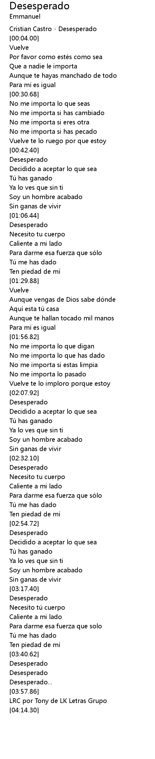 | [04:10.05] | LRC por Tony de LK Letras Grupo |