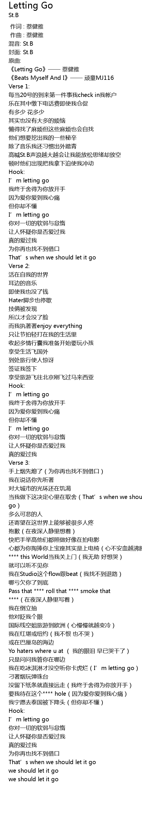 | [00:07.894] | 《Letting Go》—— 蔡健雅 |