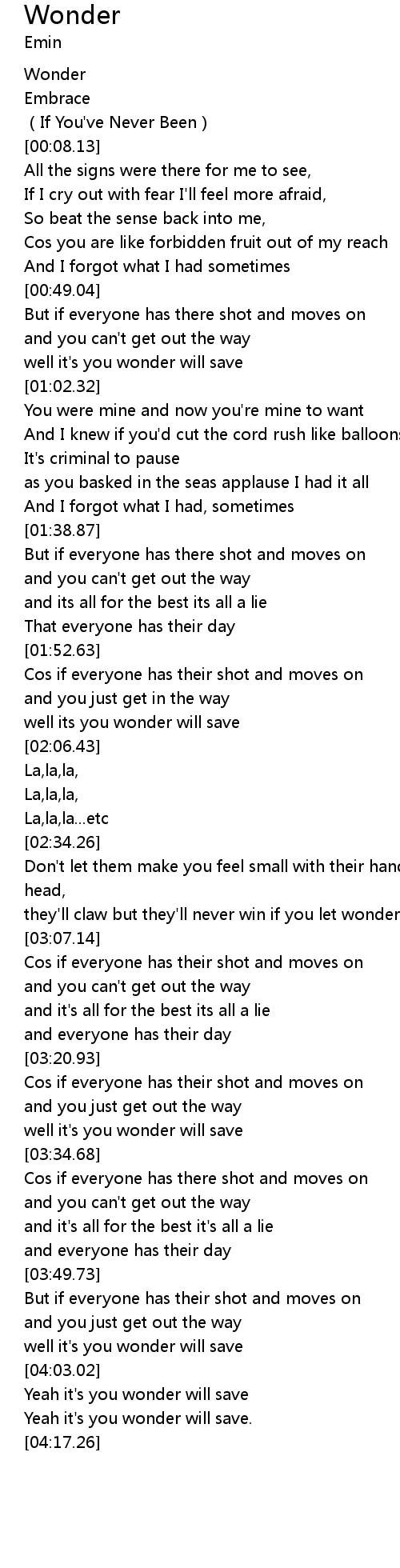 | [04:03.94] | Yeah it' s you wonder will save |
