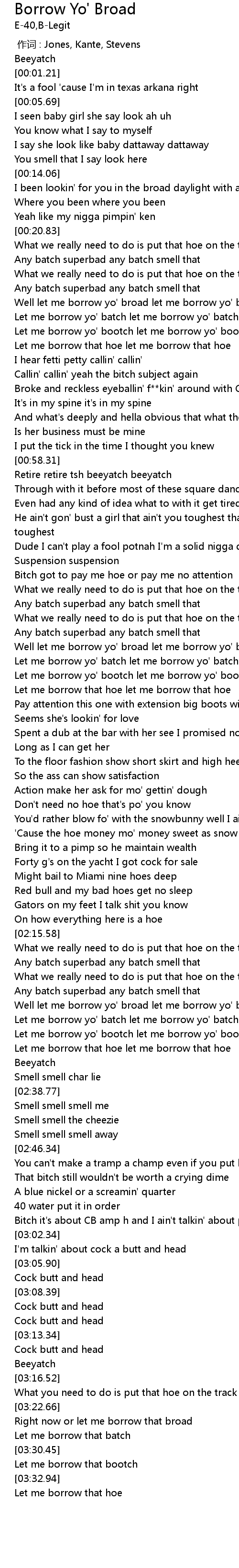 | [00:31.55] | Well let me borrow yo' broad let me borrow yo' broad |