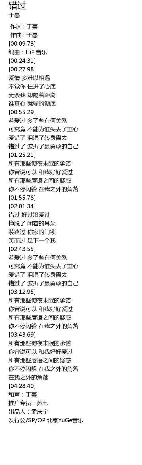 | [04:33.40] | 发行公/SP/OP:北京YuGe音乐 |