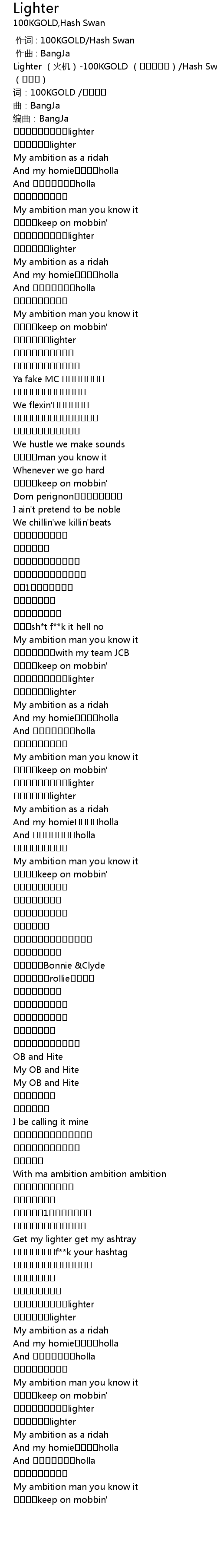 | [00:00.00] | Lighter (火机)-100KGOLD (니케이골드)/Hash Swan (쉬스완) |