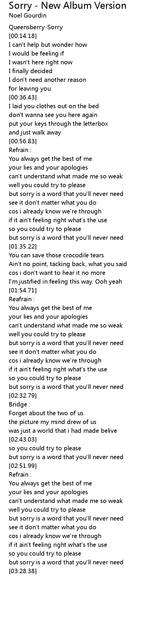 | Song | Sorry - New Album Version |