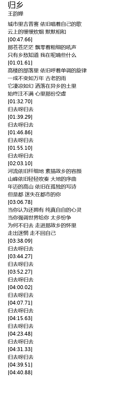 | [03:24.76] | 为何不归去 走进那故乡的怀里 |