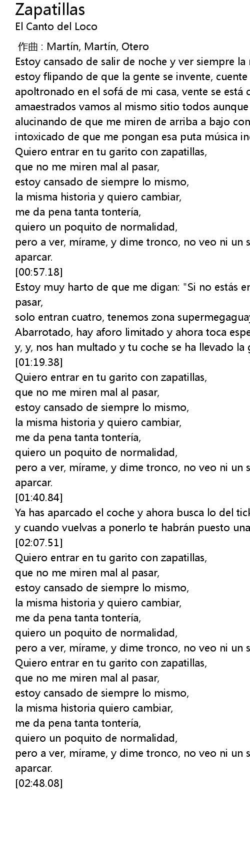 | [00:36.02] | Quiero entrar en tu garito con zapatillas, |