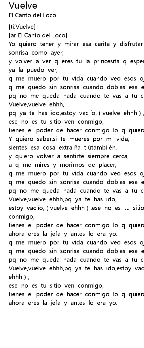| [02:16.20] | Vuelve,vuelve ehhh,pq ya te has ido,estoy vac ío,(vuelve ehhh), |