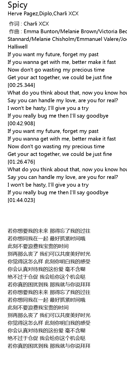 | [00:01.000] | zuò qǔ : Emma Bunton Melanie Brown Victoria Beckham Richard Stannard Melanie Chisholm Emmanuel Valere Joel Jaccoulet Matthew Rowe Geraldine Halliwell |