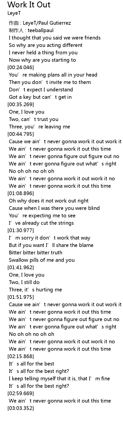 | [02:59.930] | We ain' t never gonna work it out this time |