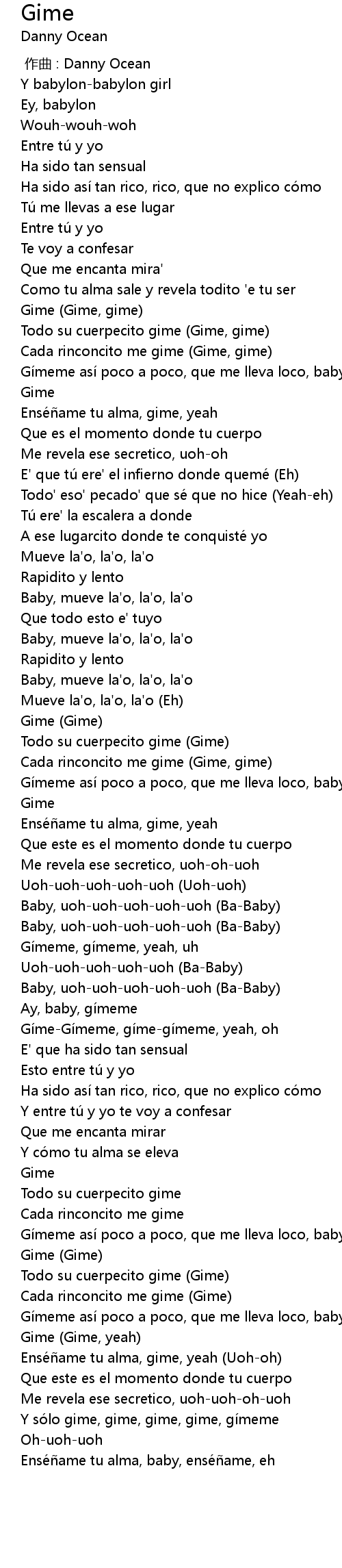 | [00:37.22] | Cada rinconcito me gime (Gime, gime) |